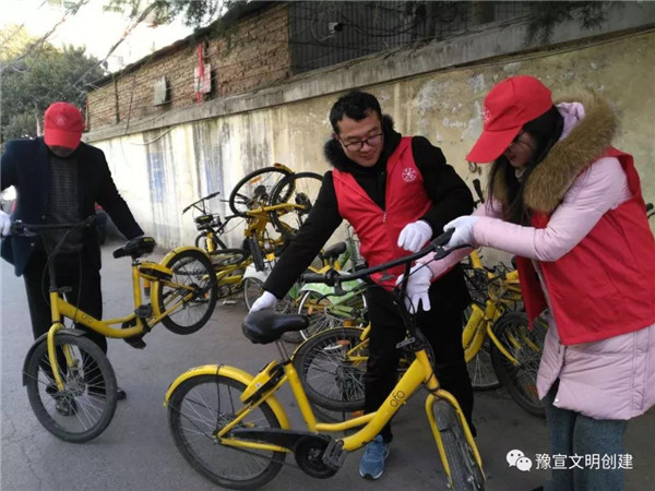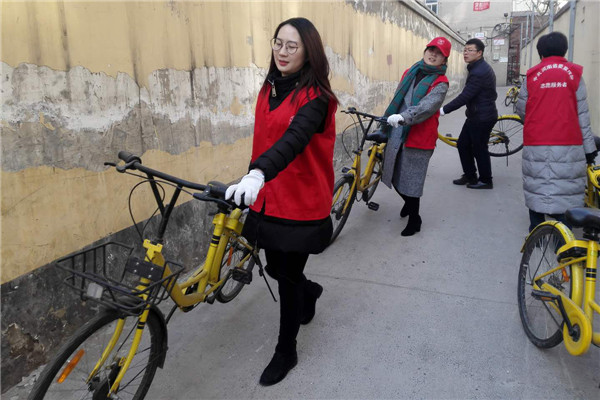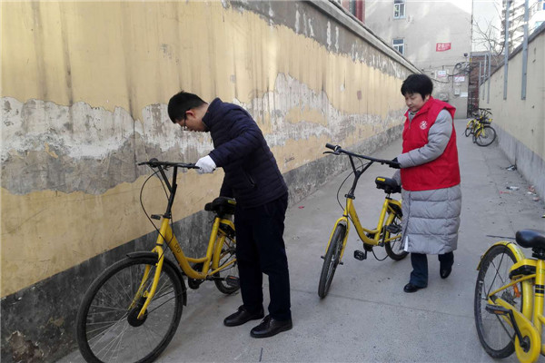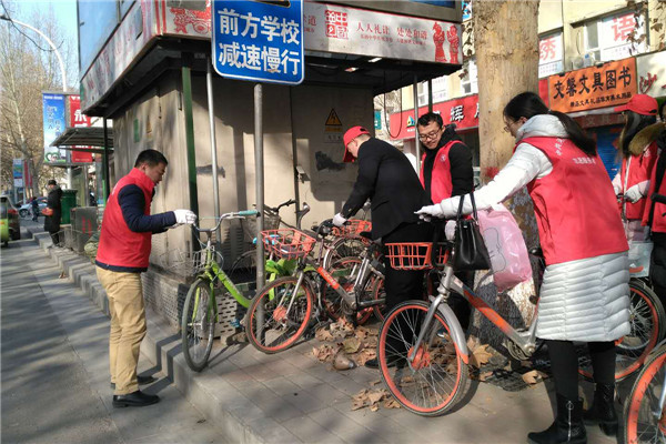 志愿者們冒著寒風和低溫,清理家屬院里違規(guī)停放小黃車,并引導社區(qū)居民講文明、樹新風,養(yǎng)成良好的行為習慣。經(jīng)過一個多小時的勞動,雖然手都凍紅了,但看到近百輛擺放的整整齊齊的單車和井然有序的院子,大家都有滿滿的成就感,也體會到了奉獻的快樂。